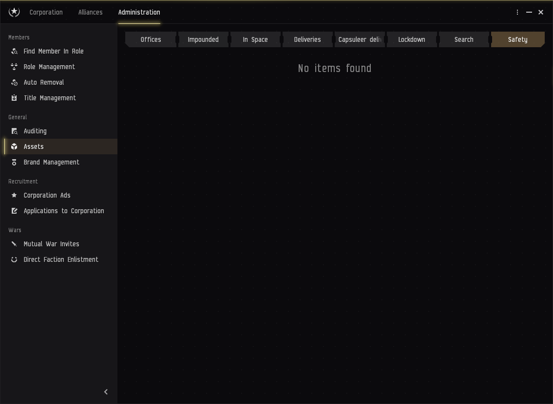 Items in Corporate Asset Safety will appear under the corporation's "Administration" tab, in the "Assets" window, and under the "Safety" tab for people with Accountant access.