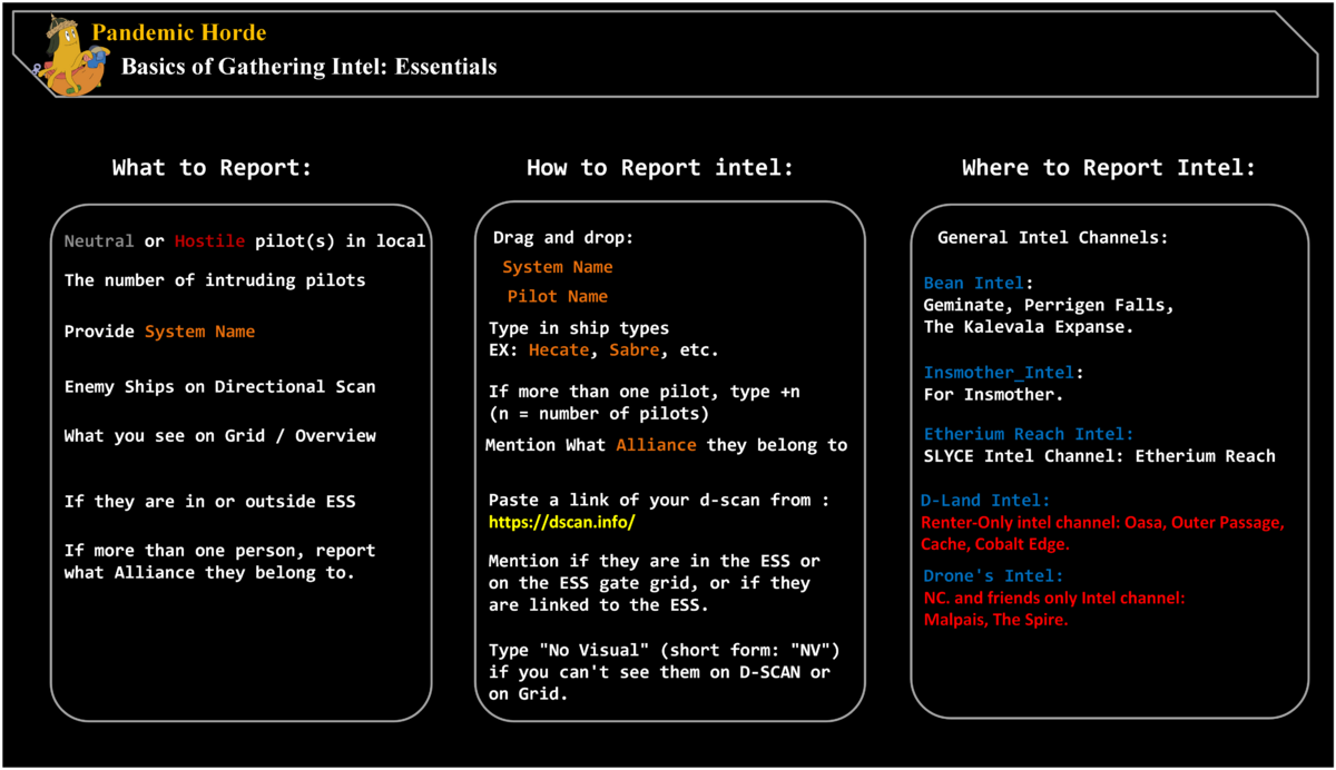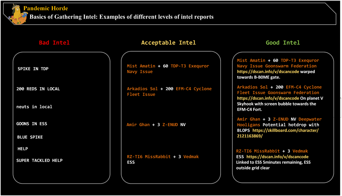 • (Note that reporting intel in hostile territory is not needed in home space intel channels.)