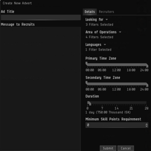 • Message to Recruits - this is the main bulk of your advert. Enter some information about your corporation here, including any pre-requisites for joining and what is different about your coporation