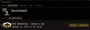 Choosing the option to Invite to Corp does the same thing as using the Invite to Corporation button at the top left of the window, and it sends the applicant a notification that they have been invited to join a corporation. They can view the invitation under  Corporation window, Recruitment tab, My applications tab and choose whether to Accept or Withdraw their invitation (see right).