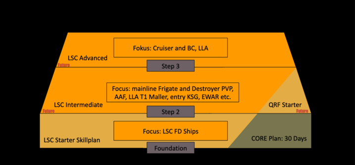 The path starts with a LSC Starter Skillplan (for Alpha), focusing on universal skills supporting the LSC Flight Deck ships, learning range control, tackling, EWAR, and pvp fundamentals. From there, pilots move into T2 frigate and destroyer PvP and can put their learned skills more into action. Advanced stages expand into cruisers, battlecruisers, and specialized fleet roles, preparing pilots for larger engagements and leadership opportunities.