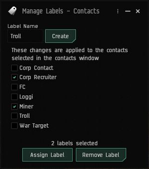 The Contacts window is used to manage your list of contacts, both individual capsuleer contacts as well as corporation and alliance contacts. In this window you can search, add, remove, and edit contacts, modify contact standing, as well as manage labels.