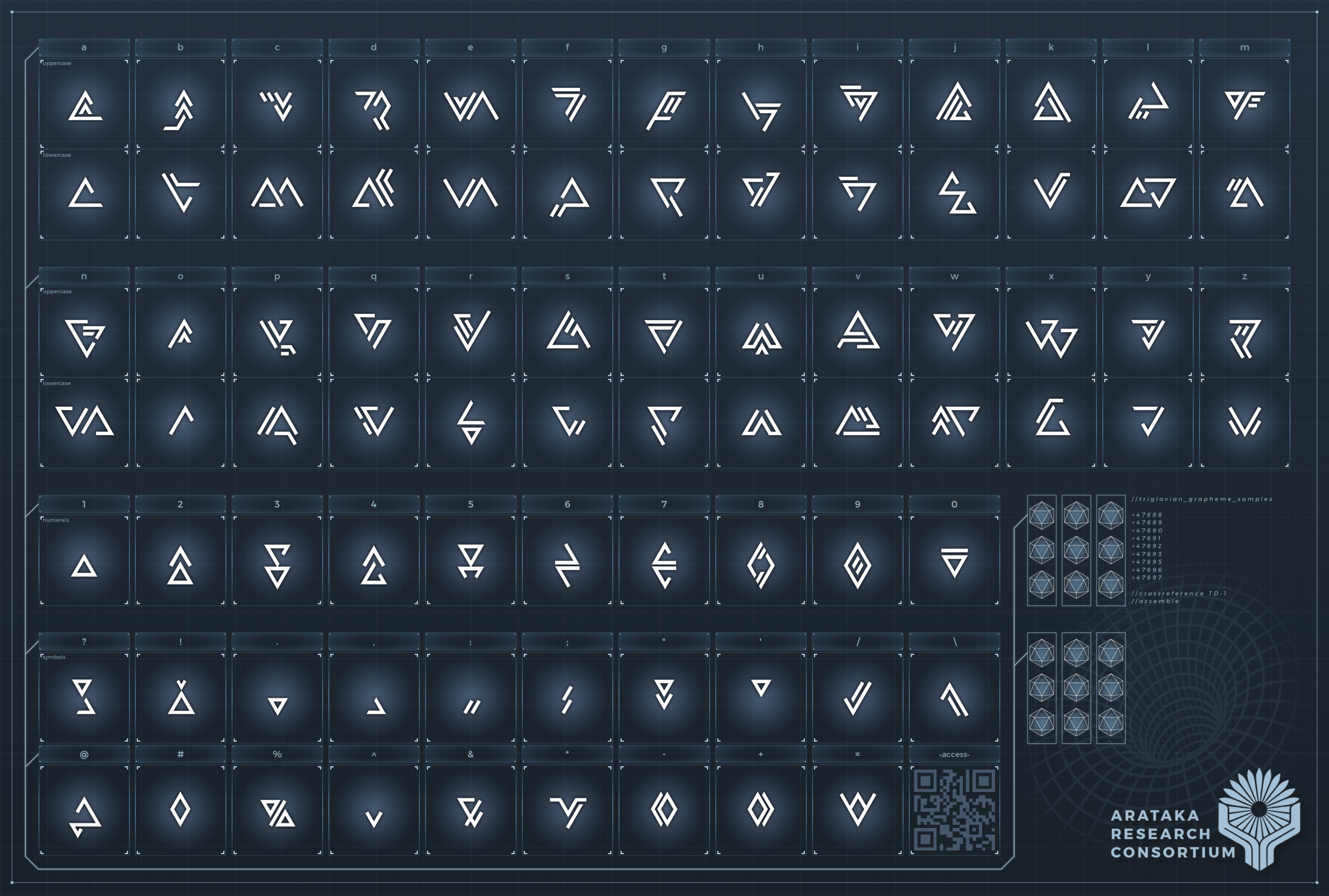 Attribution: Uriel Paradisi Anteovnuecci, of Arataka Research Consortium Src: https://www.reddit.com/r/Eve/comments/a1uo75/a_complete_and_fancy_triglavian_fontsheet_forgot/eastjpt/