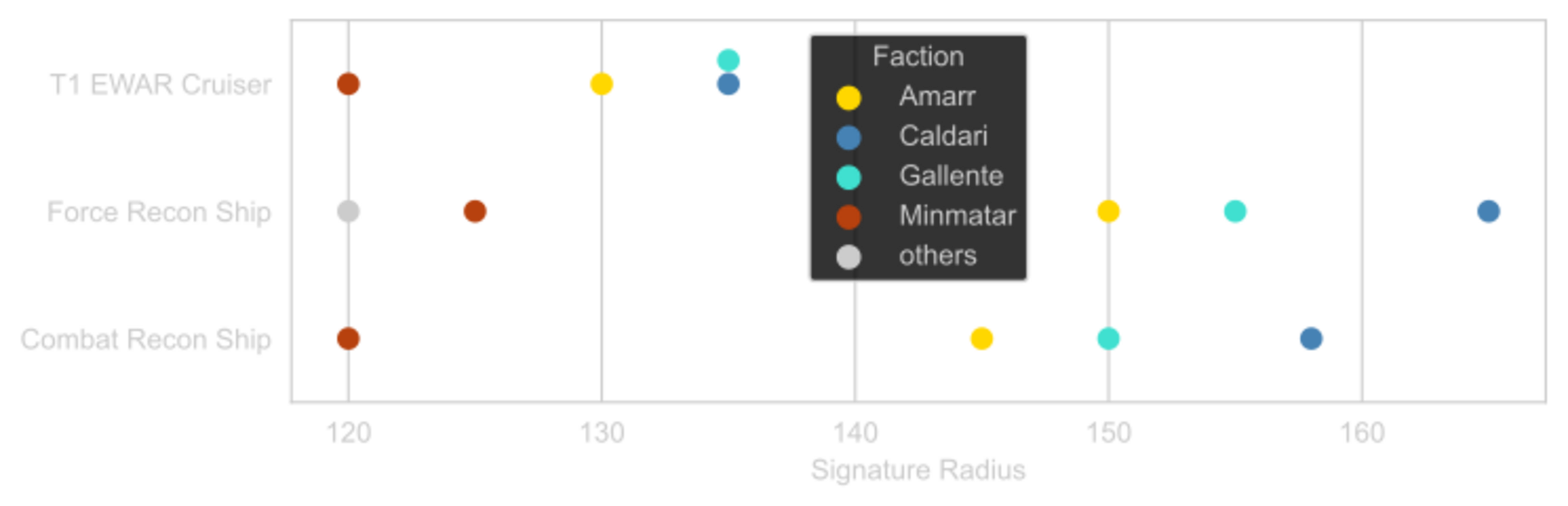 Comparison of the signature radius of cruisers with ewar bonus for the Recon Ships page. See User:Erwin Madelung/Scripts to generate ship stat plots for the code to generate this plot in case the stats change.