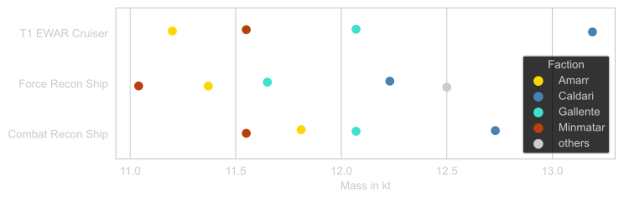 Comparison of the mass of cruisers with ewar bonus for the Recon Ships page. See User:Erwin Madelung/Scripts to generate ship stat plots for the code to generate this plot in case the stats change.